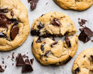 Flour, butter, brown sugar, chocolate chips, eggs, vanilla.