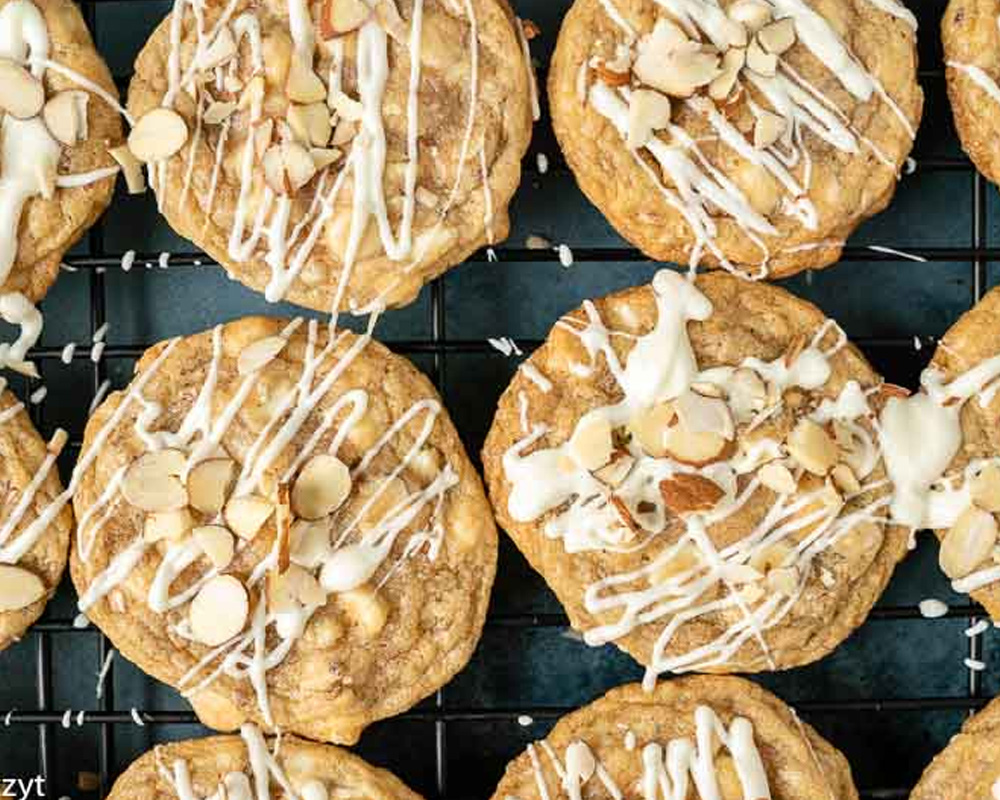 Flour, butter, brown sugar, white chocolate, almonds, raisins, eggs.